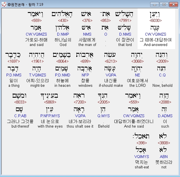 히브리어구약BHS,19 וַיַּעַן הַשָּׁלִישׁ אֶת־אִישׁ הָאֱלֹהִים וַיֹּאמַר וְהִנֵּה יְהוָה עֹשֶׂה אֲרֻבֹּות בַּשָּׁמַיִם הֲיִהְיֶה כַּדָּבָר הַזֶּה וַיֹּאמֶר הִנְּךָ רֹאֶה בְּעֵינֶיךָ וּמִשָּׁם לֹא תֹאכֵל׃