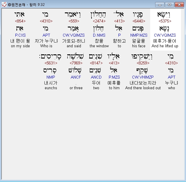 히브리어구약BHS,32 וַיִּשָּׂא פָנָיו אֶל־הַחַלֹּון וַיֹּאמֶר מִי אִתִּי מִי וַיַּשְׁקִיפוּ אֵלָיו שְׁנַיִם שְׁלֹשָׁה סָרִיסִים׃