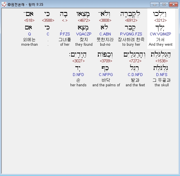 히브리어구약BHS,35 וַיֵּלְכוּ לְקָבְרָהּ וְלֹא־מָצְאוּ בָהּ כִּי אִם־הַגֻּלְגֹּלֶת וְהָרַגְלַיִם וְכַפֹּות הַיָּדָיִם׃