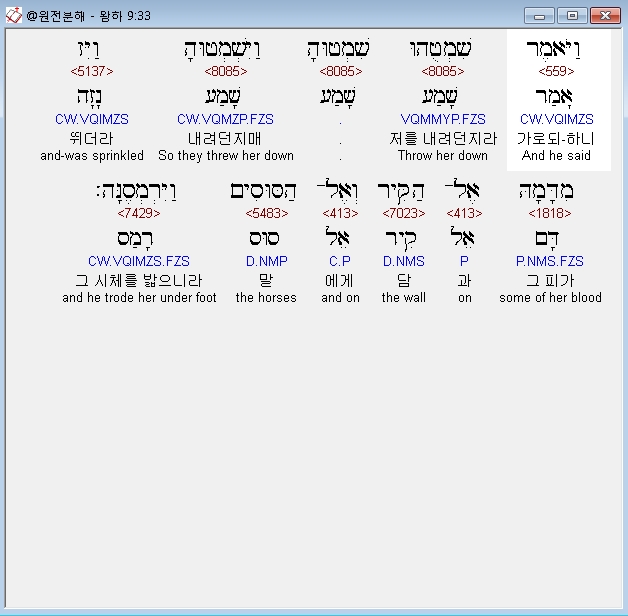 영어NRSV,33 He said, "Throw her down." So they threw her down; some of her blood spattered on the wall and on the horses, which trampled on her.