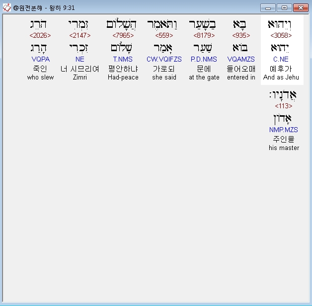 히브리어구약BHS,31 וְיֵהוּא בָּא בַשָּׁעַר וַתֹּאמֶר הֲשָׁלֹום זִמְרִי הֹרֵג אֲדֹנָיו׃