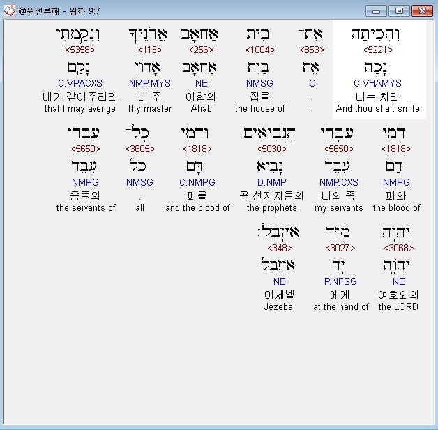 히브리어구약BHS,7 וְהִכִּיתָה אֶת־בֵּית אַחְאָב אֲדֹנֶיךָ וְנִקַּמְתִּי דְּמֵי עֲבָדַי הַנְּבִיאִים וּדְמֵי כָּל־עַבְדֵי יְהוָה מִיַּד אִיזָבֶל׃