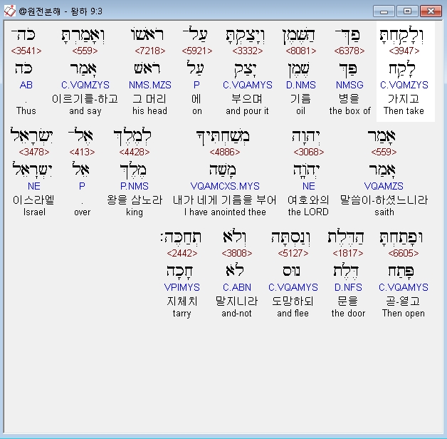 히브리어구약BHS,3 וְלָקַחְתָּ פַךְ־הַשֶּׁמֶן וְיָצַקְתָּ עַל־רֹאשֹׁו וְאָמַרְתָּ כֹּה־אָמַר יְהוָה מְשַׁחְתִּיךָ לְמֶלֶךְ אֶל־יִשְׂרָאֵל וּפָתַחְתָּ הַדֶּלֶת וְנַסְתָּה וְלֹא תְחַכֶּה׃
