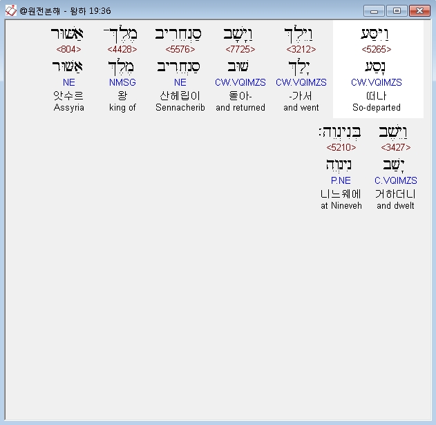 히브리어구약BHS,36 וַיִּסַּע וַיֵּלֶךְ וַיָּשָׁב סַנְחֵרִיב מֶלֶךְ־אַשּׁוּר וַיֵּשֶׁב בְּנִינְוֵה׃
