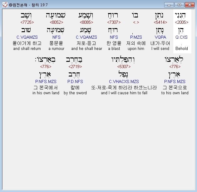 영어NASB,7 "Behold, I will put a spirit in him so that he shall hear a rumor and return to his own land. And I will make him fall by the sword in his own land." '"