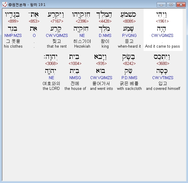 히브리어구약BHS,1 וַיְהִי כִּשְׁמֹעַ הַמֶּלֶךְ חִזְקִיָּהוּ וַיִּקְרַע אֶת־בְּגָדָיו וַיִּתְכַּס בַּשָּׂק וַיָּבֹא בֵּית יְהוָה׃