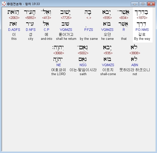 히브리어구약BHS,33 בַּדֶּרֶךְ אֲשֶׁר־יָבֹא בָּהּ יָשׁוּב וְאֶל־הָעִיר הַזֹּאת לֹא יָבֹא נְאֻם־יְהוָה׃