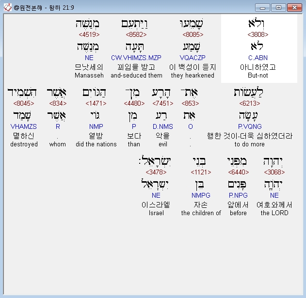 히브리어구약BHS,22 וַיַּעֲזֹב אֶת־יְהוָה אֱלֹהֵי אֲבֹתָיו וְלֹא הָלַךְ בְּדֶרֶךְ יְהוָה׃