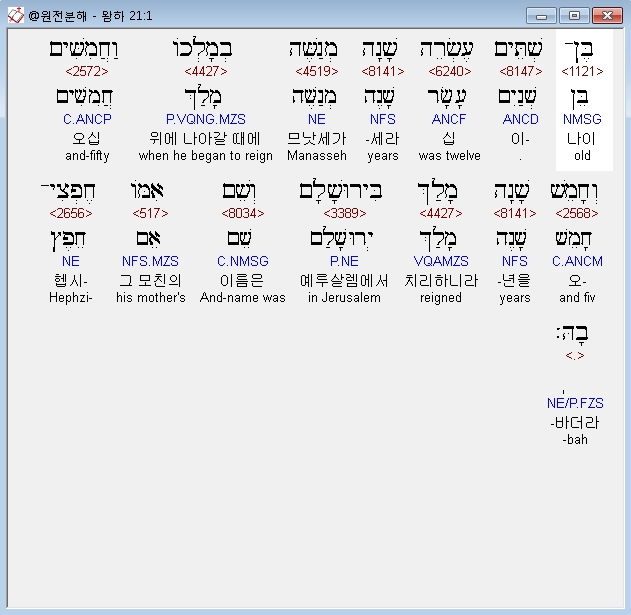 히브리어구약BHS,1 בֶּן־שְׁתֵּים עֶשְׂרֵה שָׁנָה מְנַשֶּׁה בְמָלְכֹו וַחֲמִשִּׁים וְחָמֵשׁ שָׁנָה מָלַךְ בִּירוּשָׁלִָם וְשֵׁם אִמֹּו חֶפְצִי־בָהּ׃