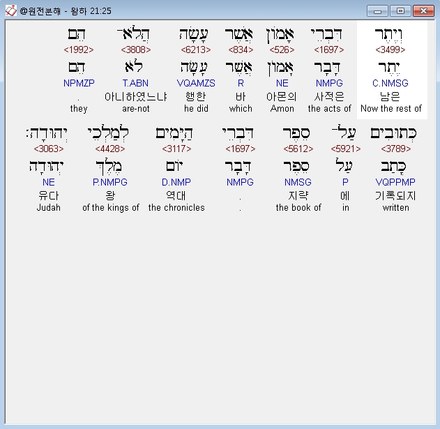 헬라어구약Septuagint,25 και τα λοιπα των λογων αμων οσα εποιησεν ουκ ιδου ταυτα γεγραμμενα επι βιβλιω λογων των ημερων τοις βασιλευσιν ιουδα