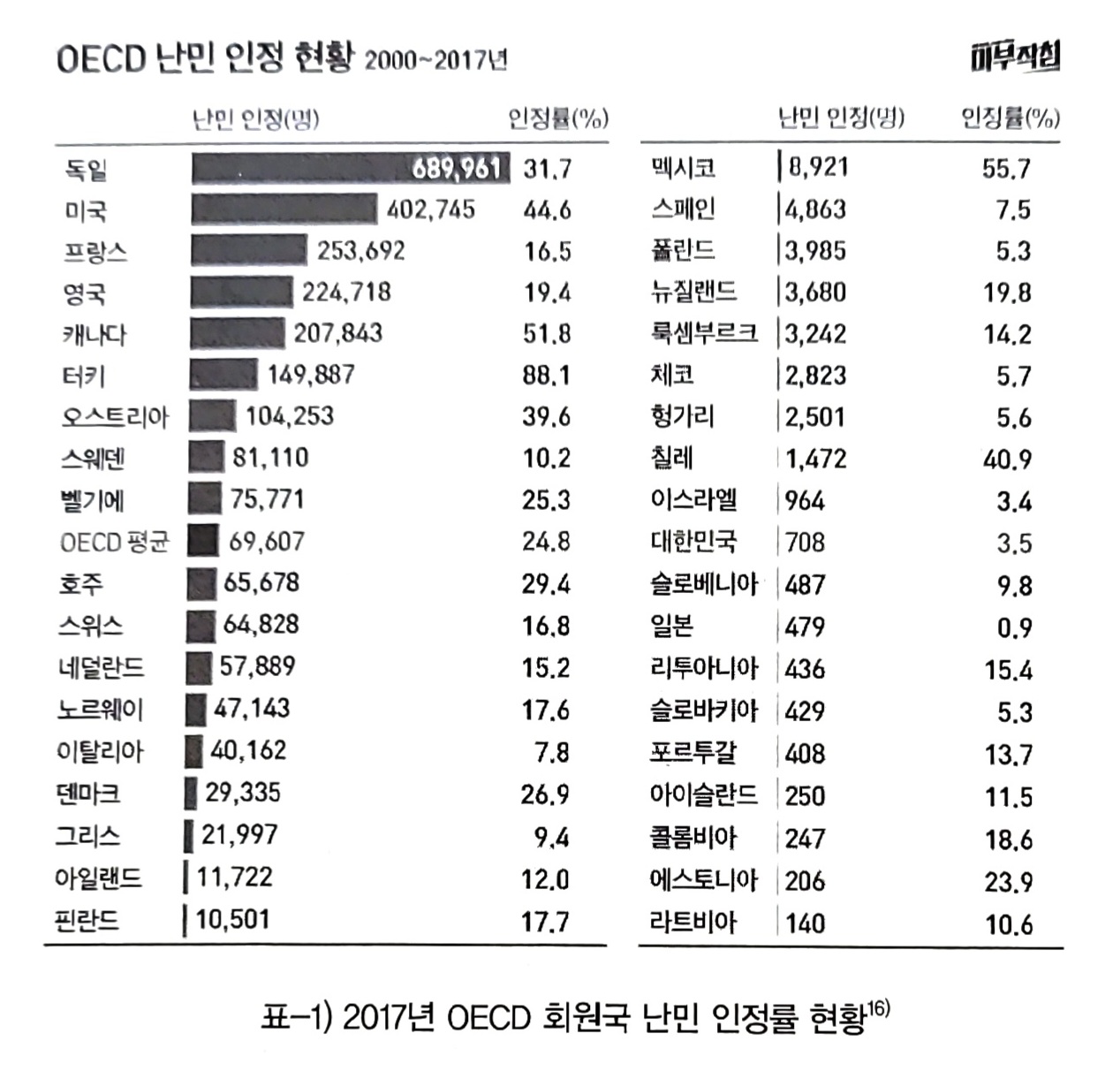 유엔난민기구에 따르면, 표-1)에서 보는 것처럼, 세계 190개국의 최근 18년(2000~2017년) 평균난민 인정률은 29.9%, 보호율은 44.2%이다. 난민 지위에 관한 의정서' 가입 145개국으로 좁히면, 인정률은 28.1%, 보호율은 42.5%이다. 경제협력개발기구 OECD 37개 회원국 기준으로는 인정률 24.8%, 보호율 38.0%이다. 선진국으로 갈수록 인정·보호율이 낮아지는 것처럼 보이지만, 이는 국가 간 편차가 가진 '평균의 함정' 때문이다. 지금 한국의 인정률은 3.5%로 OECD 국가 중 35위, 보호율도 10.7%로 역시 35위로 OECD 회원국 중 거의 하위권에 머물러 있을 정도로 매우 저조한 수치를 보이는데, 우리나라의 국력이나 인권 수준에 맞게 난민 수용과 보호 수준을 좀 더 높여야 한다.