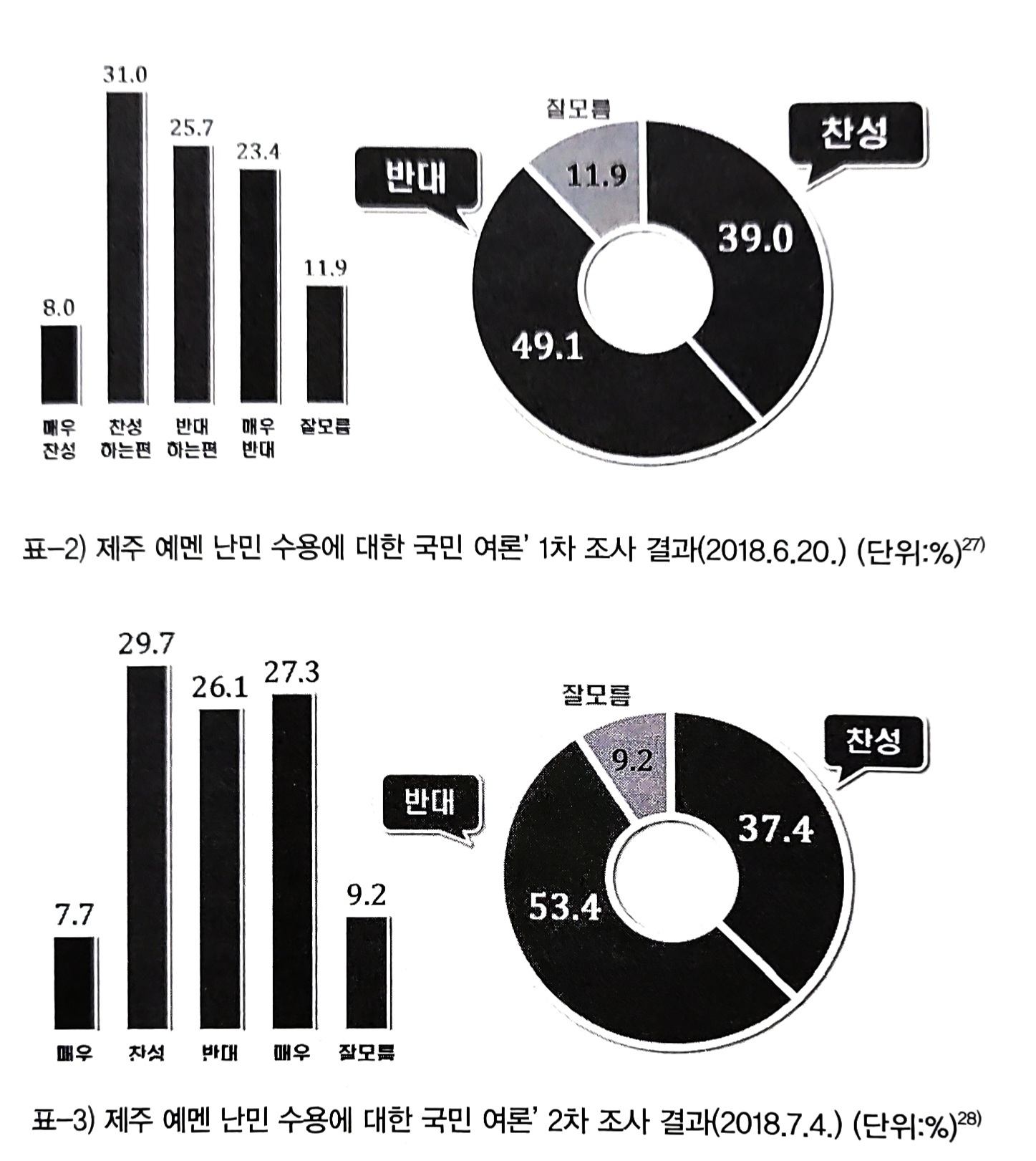 여론조사 기관인 리얼미터의 2018년 6월 20일과 7월 4일 양일에 걸쳐 실시한 '제주 예멘 난민 수용에 대한 국민 여론' 조사 결과 아래 표-2)과 표-3)에서처럼 문화적 이질감과 안전 문제에 따른 반대견해가 찬성 견해보다 대략 10~15% 정도 높았다.