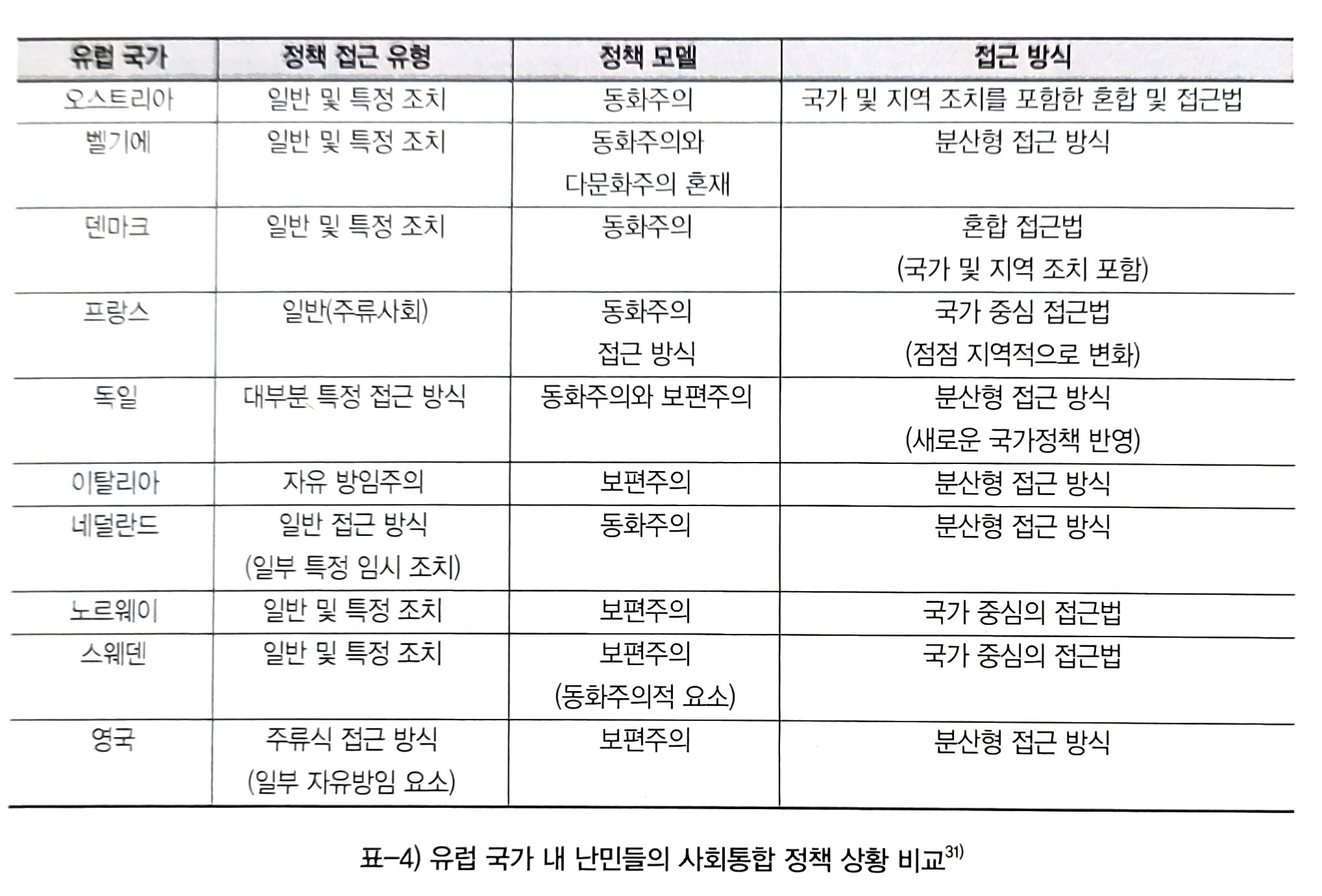 계속해서, 정연주는 현재 난민들의 80% 이상이 세계 경제의 평균 이하에도 못 미치는 나라들에 살고 있고, 그런 열악한 나라에 사는 난민들의 72% 이상이 그 나라의 평균에 미치지 못하는 형편의 사람들이 사는 빈민 지역에 살아가고 있는 통계를 인용하며 한국교회의 난민지원 필요성을 주장하고 있다. 그러나 정부가 난민들의 사회통합 정책을 진행하는 일이 결코 쉬운 일이 아니라는 것이 아래 표-4) 와 같이 유럽 국가 난민들의 사회통합 정책 상황 비교에서 짐작할 수 있고, 아직도 대부분 나라는 동화주의 정책을 진행할 수밖에 없는 상황이다.