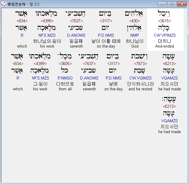 * 하나님이 그가 하시던 일을 일곱째 날에 마치시니(וַיְכַל אֱלֹהִים בַּיֹּום הַשְּׁבִיעִי מְלַאכְתֹּו - 와예칼 엘로힘 바욤 핫쉐비이 멜라크토)