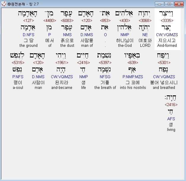 히브리어구약BHS,7 וַיִּיצֶר יְהוָה אֱלֹהִים אֶת־הָאָדָם עָפָר מִן־הָאֲדָמָה וַיִּפַּח בְּאַפָּיו נִשְׁמַת חַיִּים וַיְהִי הָאָדָם לְנֶפֶשׁ חַיָּה׃