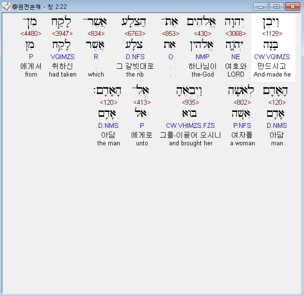 * 여호와 하나님이... 그 갈빗대로... 만드시고(וַיִּבֶן יְהוָה אֱלֹהִים אֶת־הַצֵּלָע - 와이벤 아도나이 엘로힘 엩 하체라)