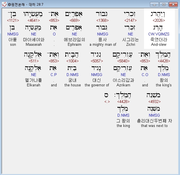 영어NIV,7 Zicri, an Ephraimite warrior, killed Maaseiah the king's son, Azrikam the officer in charge of the palace, and Elkanah, second to the king.