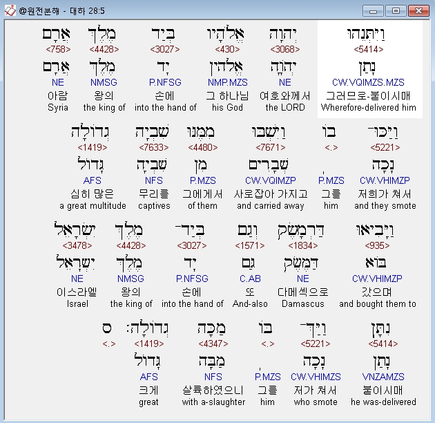 히브리어구약BHS,5 וַיִּתְּנֵהוּ יְהוָה אֱלֹהָיו בְּיַד מֶלֶךְ אֲרָם וַיַּכּוּ־בֹו וַיִּשְׁבּוּ מִמֶּנּוּ שִׁבְיָה גְדֹולָה וַיָּבִיאוּ דַּרְמָשֶׂק וְגַם בְּיַד־מֶלֶךְ יִשְׂרָאֵל נִתָּן וַיַּךְ־בֹּו מַכָּה גְדֹולָה׃ ס