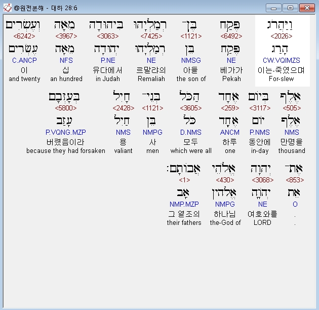 히브리어구약BHS,6 וַיַּהֲרֹג פֶּקַח בֶּן־רְמַלְיָהוּ בִּיהוּדָה מֵאָה וְעֶשְׂרִים אֶלֶף בְּיֹום אֶחָד הַכֹּל בְּנֵי־חָיִל בְּעָזְבָם אֶת־יְהוָה אֱלֹהֵי אֲבֹותָם׃