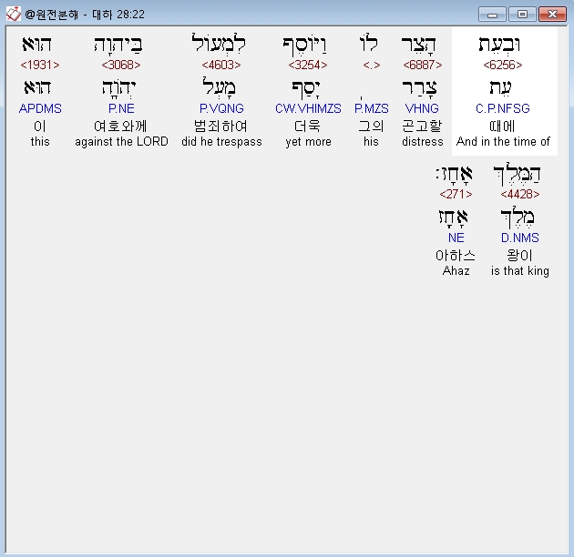 히브리어구약BHS,22 וּבְעֵת הָצֵר לֹו וַיֹּוסֶף לִמְעֹול בַּיהוָה הוּא הַמֶּלֶךְ אָחָז׃