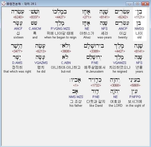영어NIV,1 Ahaz was twenty years old when he became king, and he reigned in Jerusalem sixteen years. Unlike David his father, he did not do what was right in the eyes of the LORD.