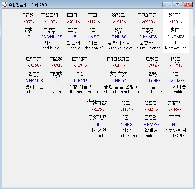 히브리어구약BHS,3 וְהוּא הִקְטִיר בְּגֵיא בֶן־הִנֹּם וַיַּבְעֵר אֶת־בָּנָיו בָּאֵשׁ כְּתֹעֲבֹות הַגֹּויִם אֲשֶׁר הֹרִישׁ יְהוָה מִפְּנֵי בְּנֵי יִשְׂרָאֵל׃