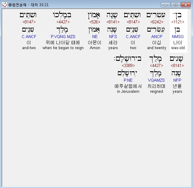 히브리어구약BHS,21 בֶּן־עֶשְׂרִים וּשְׁתַּיִם שָׁנָה אָמֹון בְּמָלְכֹו וּשְׁתַּיִם שָׁנִים מָלַךְ בִּירוּשָׁלִָם׃