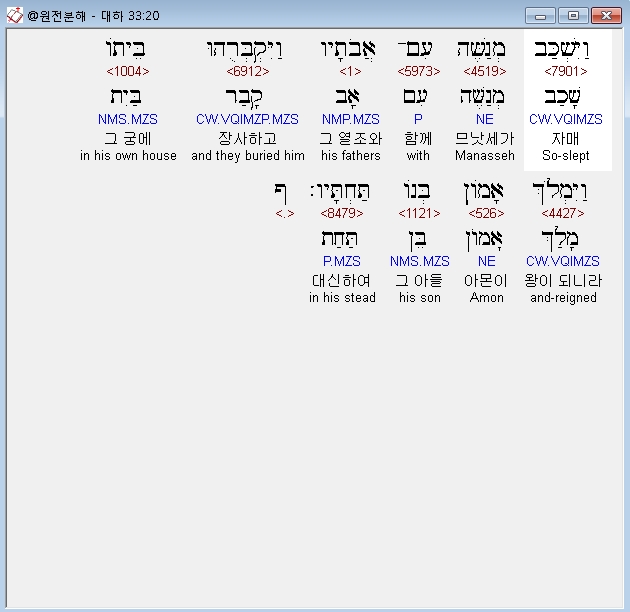 히브리어구약BHS,20 וַיִּשְׁכַּב מְנַשֶּׁה עִם־אֲבֹתָיו וַיִּקְבְּרֻהוּ בֵּיתֹו וַיִּמְלֹךְ אָמֹון בְּנֹו תַּחְתָּיו׃ ף