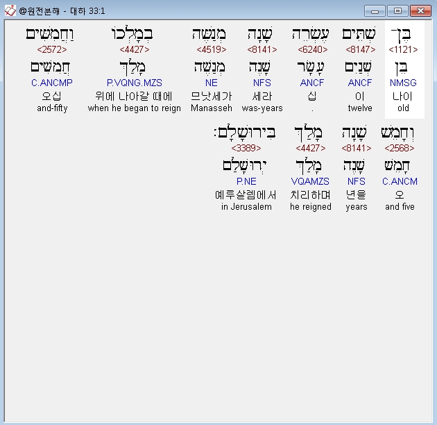 히브리어구약BHS,1 בֶּן־שְׁתֵּים עֶשְׂרֵה שָׁנָה מְנַשֶּׁה בְמָלְכֹו וַחֲמִשִּׁים וְחָמֵשׁ שָׁנָה מָלַךְ בִּירוּשָׁלִָם׃