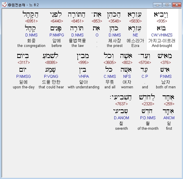 히브리어구약BHS,2 וַיָּבִיא עֶזְרָא הַכֹּהֵן אֶת־הַתֹּורָה לִפְנֵי הַקָּהָל מֵאִישׁ וְעַד־אִשָּׁה וְכֹל מֵבִין לִשְׁמֹעַ בְּיֹום אֶחָד לַחֹדֶשׁ הַשְּׁבִיעִי׃