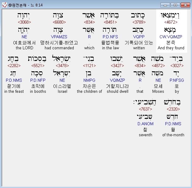 히브리어구약BHS,14 וַיִּמְצְאוּ כָּתוּב בַּתֹּורָה אֲשֶׁר צִוָּה יְהוָה בְּיַד־מֹשֶׁה אֲשֶׁר יֵשְׁבוּ בְנֵי־יִשְׂרָאֵל בַּסֻּכֹּות בֶּחָג בַּחֹדֶשׁ הַשְּׁבִיעִי׃