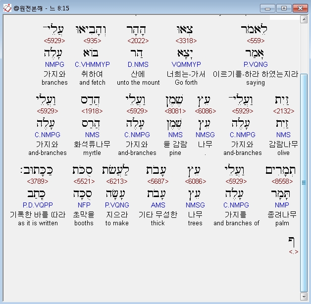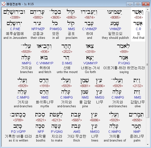 영어NASB,15 So they proclaimed and circulated a proclamation in all their cities and in Jerusalem, saying, "Go out to the hills, and bring olive branches, and wild olive branches, myrtle branches, palm branches, and branches of other leafy trees, to make booths, as it is written."