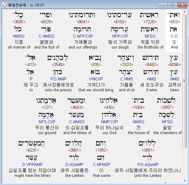 히브리어구약BHS,37 וְאֶת־רֵאשִׁית עֲרִיסֹתֵינוּ וּתְרוּמֹתֵינוּ וּפְרִי כָל־עֵץ תִּירֹושׁ וְיִצְהָר נָבִיא לַכֹּהֲנִים אֶל־לִשְׁכֹות בֵּית־אֱלֹהֵינוּ וּמַעְשַׂר אַדְמָתֵנוּ לַלְוִיִּם וְהֵם הַלְוִיִּם הַמְעַשְּׂרִים בְּכֹל עָרֵי עֲבֹדָתֵנוּ׃
