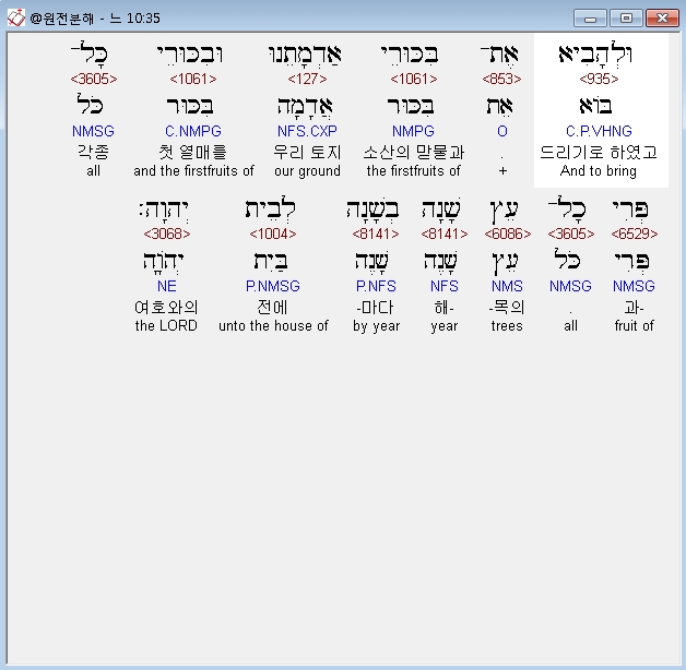 히브리어구약BHS,35 וּלְהָבִיא אֶת־בִּכּוּרֵי אַדְמָתֵנוּ וּבִכּוּרֵי כָּל־פְּרִי כָל־עֵץ שָׁנָה בְשָׁנָה לְבֵית יְהוָה׃