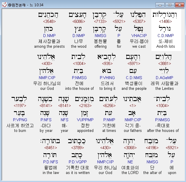 히브리어구약BHS,34 וְהַגֹּורָלֹות הִפַּלְנוּ עַל־קֻרְבַּן הָעֵצִים הַכֹּהֲנִים הַלְוִיִּם וְהָעָם לְהָבִיא לְבֵית אֱלֹהֵינוּ לְבֵית־אֲבֹתֵינוּ לְעִתִּים מְזֻמָּנִים שָׁנָה בְשָׁנָה לְבַעֵר עַל־מִזְבַּח יְהוָה אֱלֹהֵינוּ כַּכָּתוּב בַּתֹּורָה׃