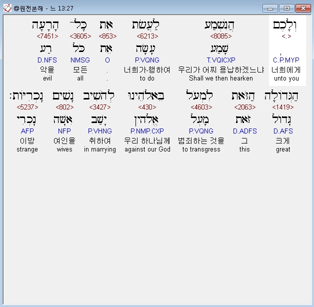 히브리어구약BHS,27 וְלָכֶם הֲנִשְׁמַע לַעֲשֹׂת אֵת כָּל־הָרָעָה הַגְּדֹולָה הַזֹּאת לִמְעֹל בֵּאלֹהֵינוּ לְהֹשִׁיב נָשִׁים נָכְרִיֹּות׃