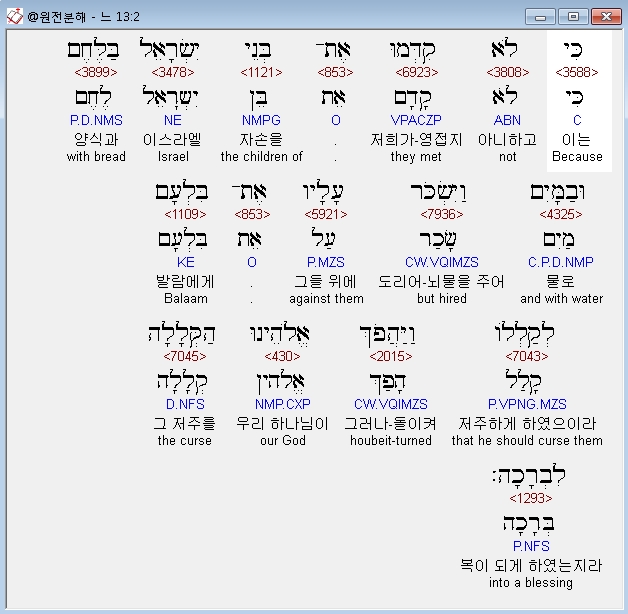 히브리어구약BHS,2 כִּי לֹא קִדְּמוּ אֶת־בְּנֵי יִשְׂרָאֵל בַּלֶּחֶם וּבַמָּיִם וַיִּשְׂכֹּר עָלָיו אֶת־בִּלְעָם לְקַלְלֹו וַיַּהֲפֹךְ אֱלֹהֵינוּ הַקְּלָלָה לִבְרָכָה׃