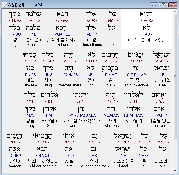 히브리어구약BHS,26 הֲלֹוא עַל־אֵלֶּה חָטָא־שְׁלֹמֹה מֶלֶךְ יִשְׂרָאֵל וּבַגֹּויִם הָרַבִּים לֹא־הָיָה מֶלֶךְ כָּמֹהוּ וְאָהוּב לֵאלֹהָיו הָיָה וַיִּתְּנֵהוּ אֱלֹהִים מֶלֶךְ עַל־כָּל־יִשְׂרָאֵל גַּם־אֹותֹו הֶחֱטִיאוּ הַנָּשִׁים הַנָּכְרִיֹּות׃