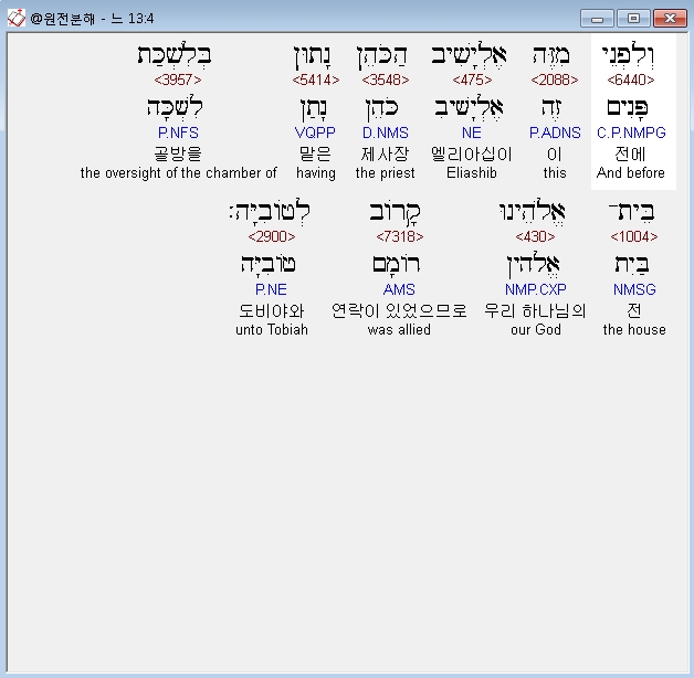 히브리어구약BHS,4 וְלִפְנֵי מִזֶּה אֶלְיָשִׁיב הַכֹּהֵן נָתוּן בְּלִשְׁכַּת בֵּית־אֱלֹהֵינוּ קָרֹוב לְטֹובִיָּה׃