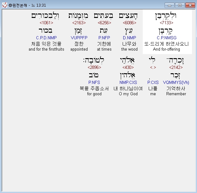히브리어구약BHS,31 וּלְקֻרְבַּן הָעֵצִים בְּעִתִּים מְזֻמָּנֹות וְלַבִּכּוּרִימ* זָכְרָה־לִּי אֱלֹהַי לְטֹובָה׃
