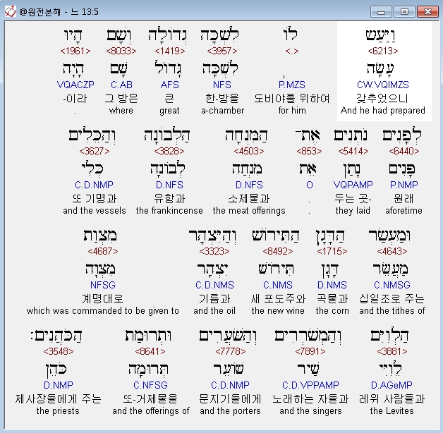 히브리어구약BHS,5 וַיַּעַשׂ לֹו לִשְׁכָּה גְדֹולָה וְשָׁם הָיוּ לְפָנִים נֹתְנִים אֶת־הַמִּנְחָה הַלְּבֹונָה וְהַכֵּלִים וּמַעְשַׂר הַדָּגָן הַתִּירֹושׁ וְהַיִּצְהָר מִצְוַת הַלְוִיִּם וְהַמְשֹׁרְרִים וְהַשֹּׁעֲרִים וּתְרוּמַת הַכֹּהֲנִים׃