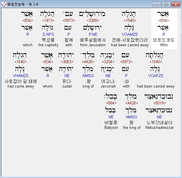 히브리어구약BHS,6 אֲשֶׁר הָגְלָה מִירוּשָׁלַיִם עִם־הַגֹּלָה אֲשֶׁר הָגְלְתָה עִם יְכָנְיָה מֶלֶךְ־יְהוּדָה אֲשֶׁר הֶגְלָה נְבוּכַדְנֶאצַּר מֶלֶךְ בָּבֶל׃