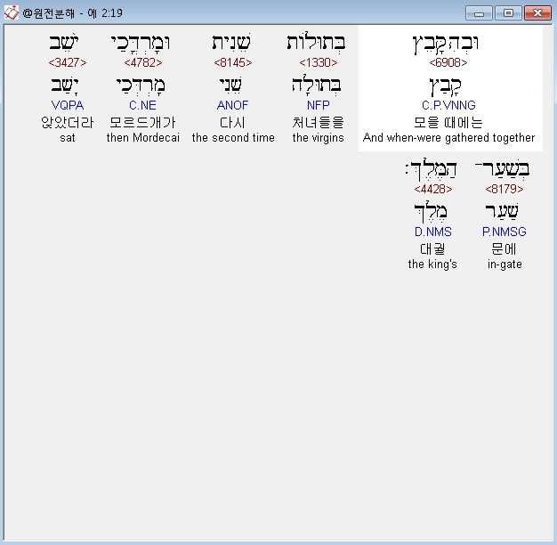 영어NRSV,19 When the virgins were being gathered together, Mordecai was sitting at the king's gate.