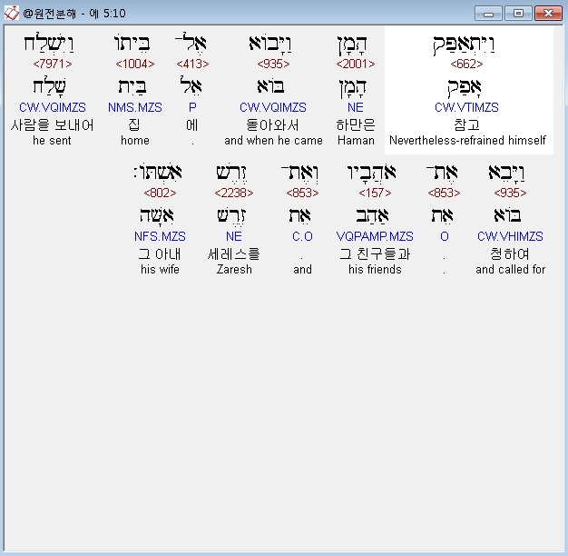히브리어구약bhs,10 וַיִּתְאַפַּק הָמָן וַיָּבֹוא אֶל־בֵּיתֹו וַיִּשְׁלַח וַיָּבֵא אֶת־אֹהֲבָיו וְאֶת־זֶרֶשׁ אִשְׁתֹּו׃