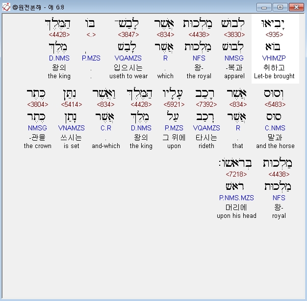 | 히브리어 에스더 8장 전체 원어 원문 성경 공부 주석 강해 설교 해설 해석 (0) | 2020.10.10 |