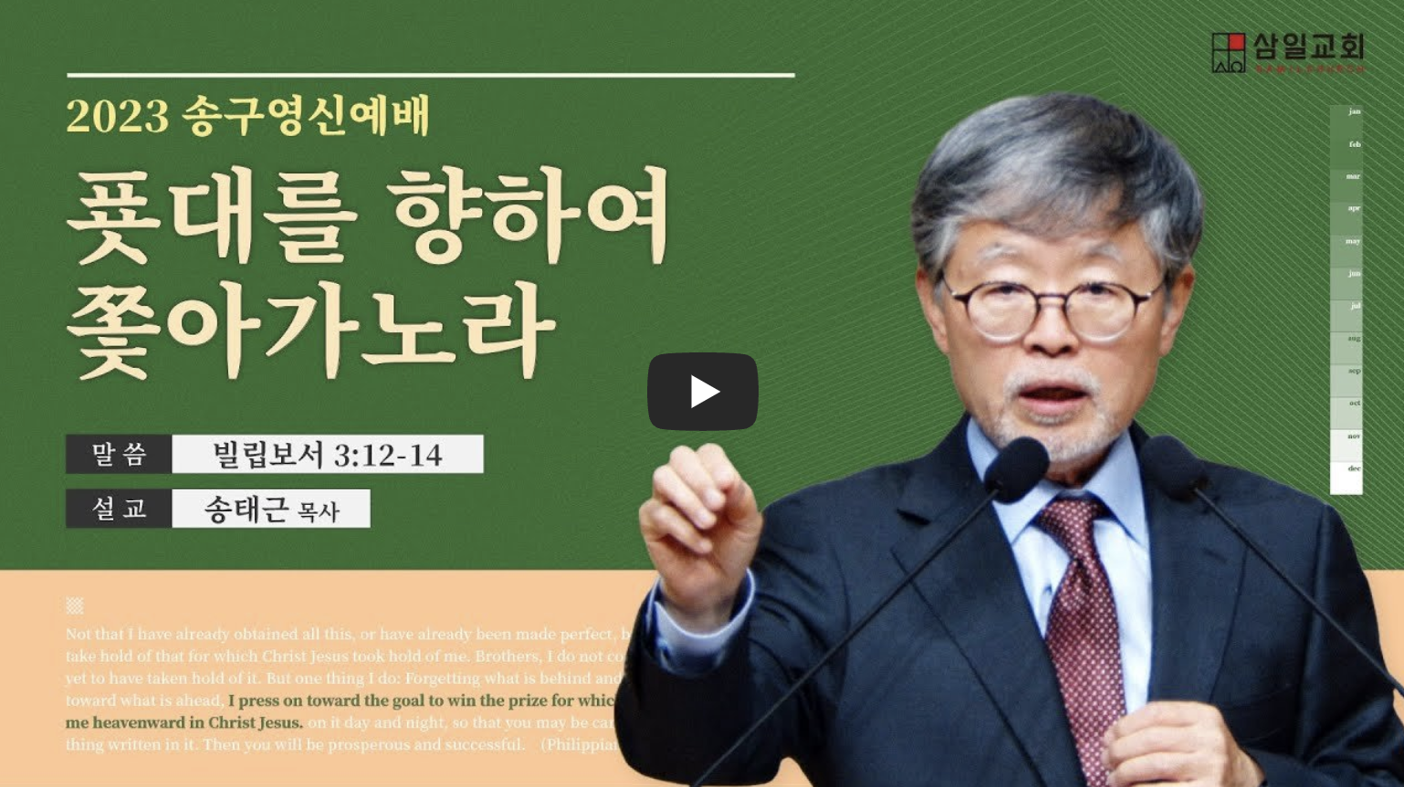 오늘의 본문은 "푯대를 향하여 달려가라"는 제목으로 나눠 보겠습니다. 우리가 읽은 빌립보서 3장에서는 사도 바울이 자신을 향한 부르심과, 그 목표를 향해 달려가는 모습을 보여줍니다. 12절에서 바울은 "내가 이미 얻었다 함도 아니요, 온전히 이루었다 함도 아니라"라고 말합니다. 즉, 그는 아직 완성되지 않았다고 고백합니다. 얼마 전, 한 유튜브 방송에서 인터뷰를 받으면서 첫 질문을 받았습니다. "목사님의 리즈 시절은 언제였습니까?" 과거의 전성기를 물었지만, 저는 "아직 오지 않았습니다"라고 대답했습니다. 이는 바울이 말한 것처럼, 우리의 리즈 시절은 과거에 있지 않으며, 아직 다가오지 않았다는 뜻입니다. 바울은 사역을 많이 했고, 로마 제국 하에서 어려운 상황 속에서도 글을 쓰고 있었습니다. 그럼에도 불구하고, 그는 자신이 아직 완전히 이루지 못했다고 고백합니다. 그는 경주자의 이미지를 사용하여 "나는 아직 달려갈 길이 남아 있다"라고 표현합니다.