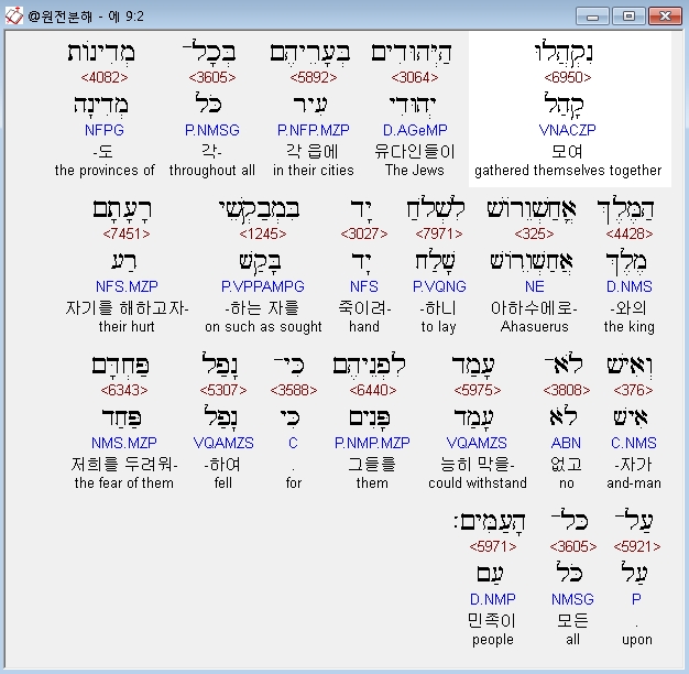 히브리어구약bhs,2 נִקְהֲלוּ הַיְּהוּדִים בְּעָרֵיהֶם בְּכָל־מְדִינֹות הַמֶּלֶךְ אֳחַשְׁוֵרֹושׁ לִשְׁלֹחַ יָד בִּמְבַקְשֵׁי רָעָתָם וְאִישׁ לֹא־עָמַד לִפְנֵיהֶם כִּי־נָפַל פַּחְדָּם עַל־כָּל־הָעַמִּים׃