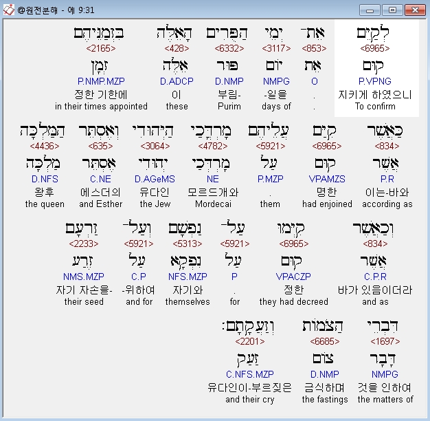 히브리어구약bhs,31 לְקַיֵּם אֵת־יְמֵי הַפֻּרִים הָאֵלֶּה בִּזְמַנֵּיהֶם כַּאֲשֶׁר קִיַּם עֲלֵיהֶם מָרְדֳּכַי הַיְּהוּדִי וְאֶסְתֵּר הַמַּלְכָּה וְכַאֲשֶׁר קִיְּמוּ עַל־נַפְשָׁם וְעַל־זַרְעָם דִּבְרֵי הַצֹּמֹות וְזַעֲקָתָם׃