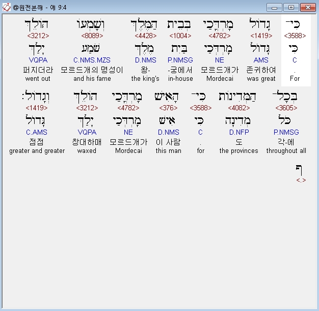 히브리어구약bhs,4 כִּי־גָדֹול מָרְדֳּכַי בְּבֵית הַמֶּלֶךְ וְשָׁמְעֹו הֹולֵךְ בְּכָל־הַמְּדִינֹות כִּי־הָאִישׁ מָרְדֳּכַי הֹולֵךְ וְגָדֹול׃ ף
