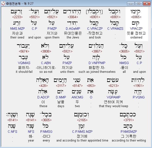 히브리어구약bhs,27 קִיְּמוּ [כ= וְקִבֵּל] [ק= וְקִבְּלוּ] הַיְּהוּדִים עֲלֵיהֶם וְעַל־זַרְעָם וְעַל כָּל־הַנִּלְוִים עֲלֵיהֶם וְלֹא יַעֲבֹור לִהְיֹות עֹשִׂים אֵת שְׁנֵי הַיָּמִים הָאֵלֶּה כִּכְתָבָם וְכִזְמַנָּם בְּכָל־שָׁנָה וְשָׁנָה׃